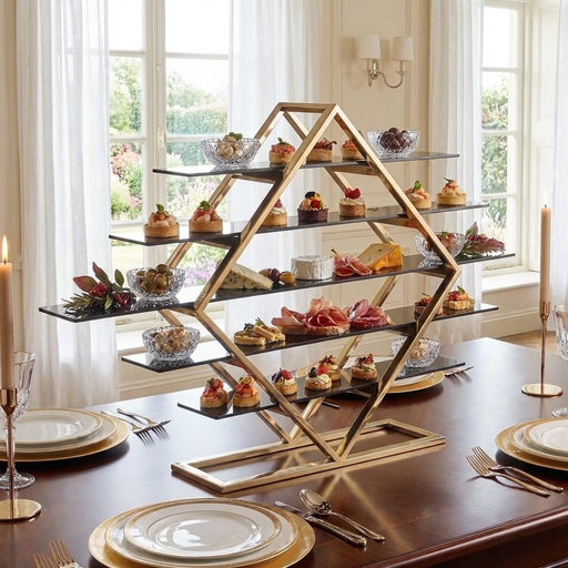 View full detailsElevate your buffet presentation with this 5-tier golden food display stand. Featuring a luxurious gold steel frame and five sleek black glass plat...