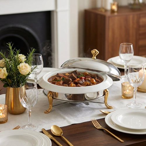 View full detailsElevate your buffet presentation with our Golden & Silver Round Stainless Steel Crown Food Warmer, designed to combine elegance, durability, an...