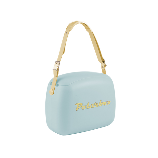 صندوق تبريد بولاربوكس 12 لتر كلاسيك مع حزام جلدي، أزرق سماوي وأصفر، هو صندوق تبريد صلب محمول وواسع مثالي للنزهات، رحلات الشاطئ، والمغامرات الخارجية...