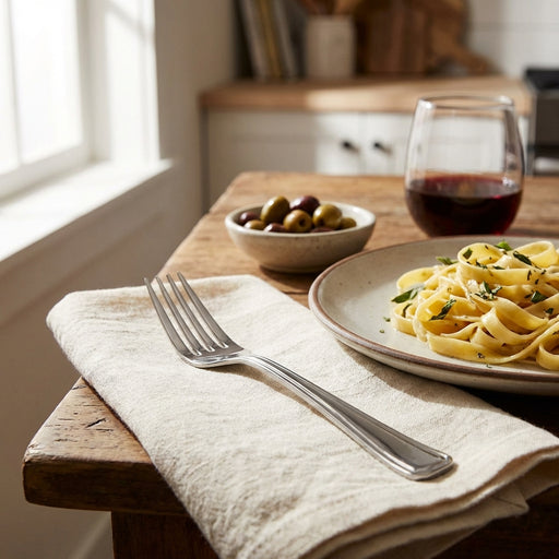 قم بطي مناديل المائدة بأناقة عن طريق وضع ملعقة وشوكة بشكل مائل على المنديل. اطوِ المنديل فوق الأدوات، مما يخلق عرضًا أنيقًا ومرتبًا لترتيب مائدتك.